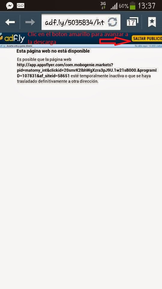 3. Como se ve en la imagen anterior nos ha aparecido un botón amarillo en la parte superior derecha que pone“Saltar publicidad”, hacemos clic en él y nos llevará al enlace de la descarga.